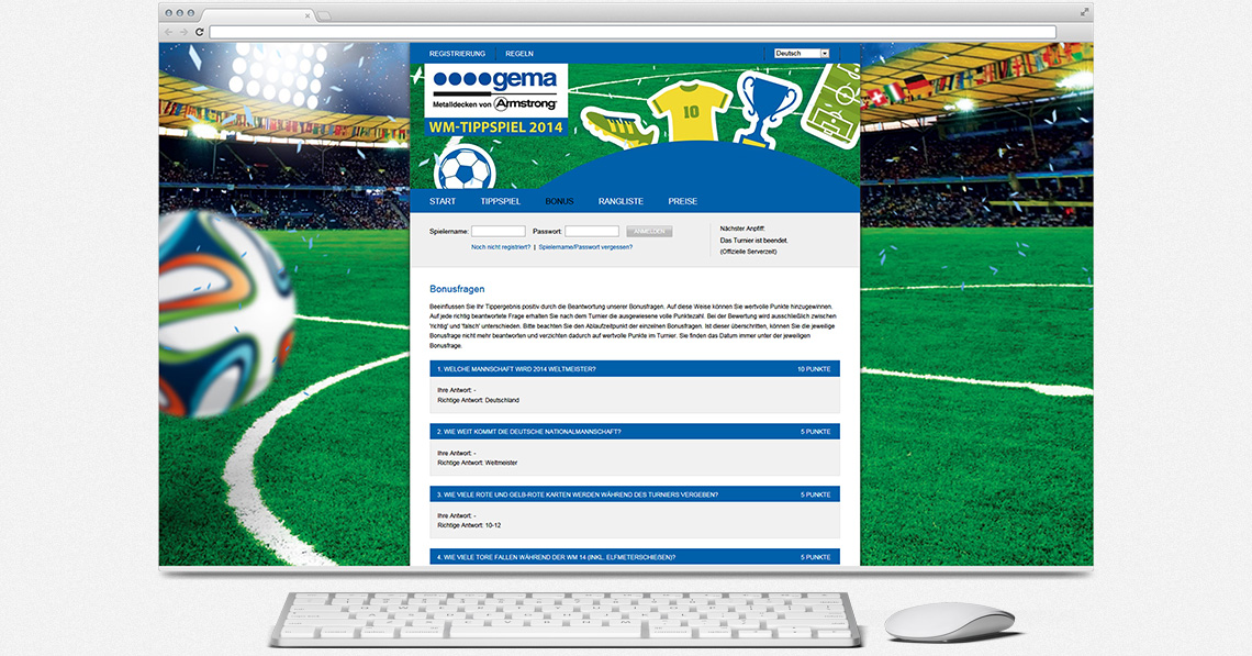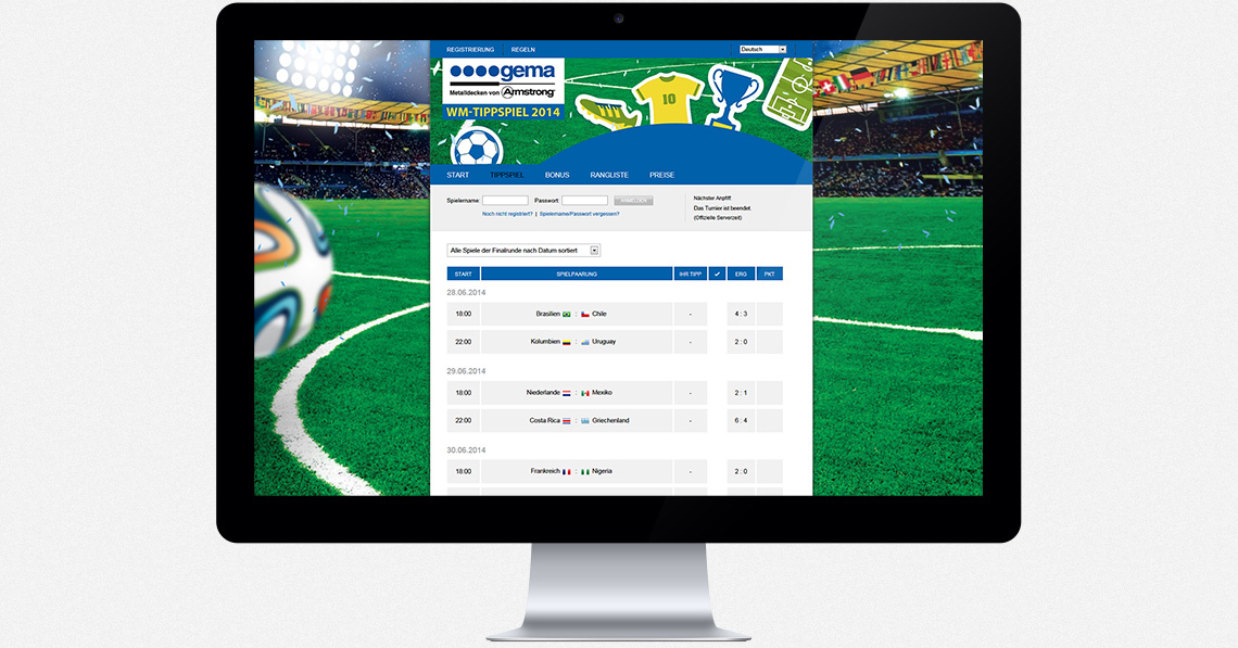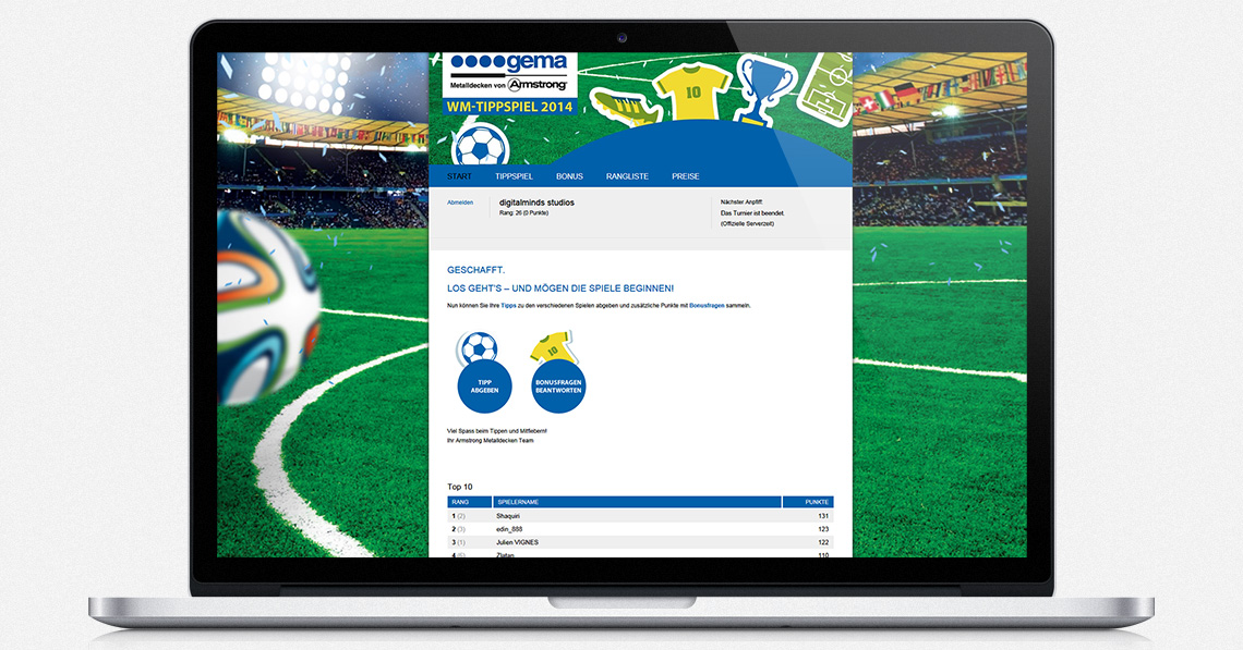 digitalminds studios hat für den Unternehmen Armstrong Metalldecken AG ein neuartiges online WM-Tippspiel eingerichtet. Die Besucher können so online eigene Spielerprofile anlegen. Ranglisten der besten Tipper werden nach jedem Spiel automatisch errechnet.